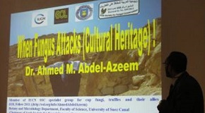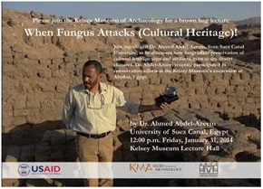 وكانت المحاضرة الاولى تحت عنوان "متى يهاجم الفطر التراث الثقافى" يوم 31 يناير 2014 فى متحف كيلسى للمهتمين والمتخصصين فى مجال الفطريات. وخلال المحاضرة تم عرض نتائج الدراسة التى اجريت فى ابيدوس ودور الفطريات فى تحليل العينات الخشبية والتى تعود الى 6500 سنة